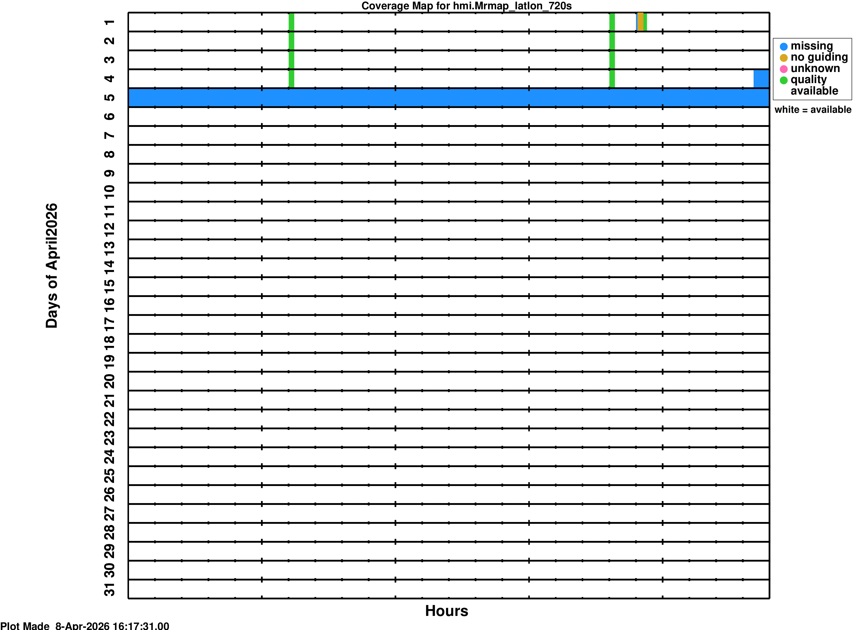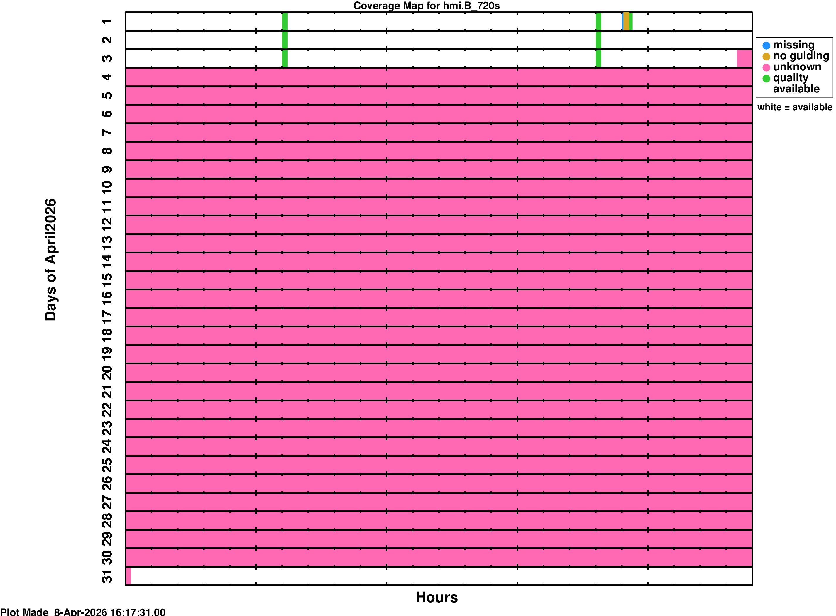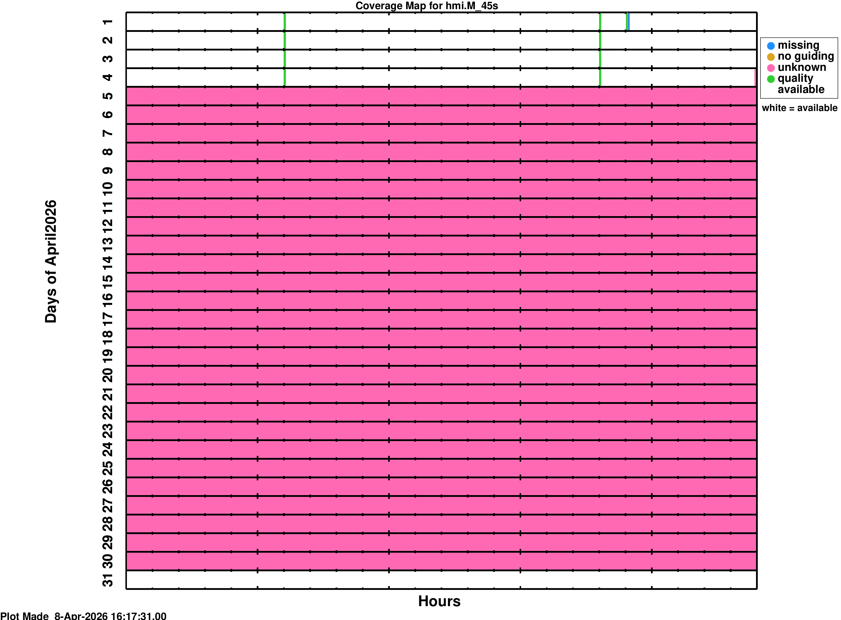 YYYY_MM_map.png is a coverage map for the series hmi.V_45s YYYY_MM_map_m.png is a coverage map for the series hmi.M_45s YYYY_MM_map_s720.png is a coverage map for the series hmi.S_720s YYYY_MM_map_m720.png is a coverage map for the series hmi.M_720sWhite spaces on the coverage maps indicate time where data is ready for use. The colors on the coverage map indicate times where the data product is not available or has some QUALITY bits set. Colors mean: