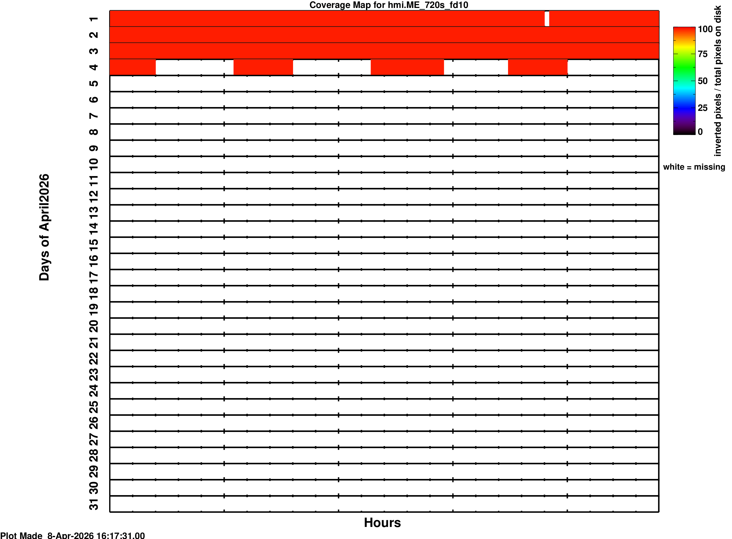 YYYY_MM_fd10_nrt.png is a coverage map for the series hmi.ME_720s_fd10_nrt YYYY_MM_fd_fd10.png is a coverage map for the series hmi.ME_72s_fd10The coverage maps in the /fd10 series are a montage of two maps: The left map shows coverage for hmi.S_720s and follows the color schemes outlined above. For the right map, colored spaces indicate times when inverted data is present; the color of the data correspond to the value of (INVNPROC) / ( PI*(RSUN_OBS*(1/CDELT1))^2 ), or (the number of inverted pixels)/(total number of pixels within the solar radius). Values greater than 1 are truncated to 1. The keywords RSUN_OBS and CDELT1 are obtained from the appropriate time in the hmi.S_720s data. White spaces indicate times where the stokes data are available but the inversion module has not yet been run.